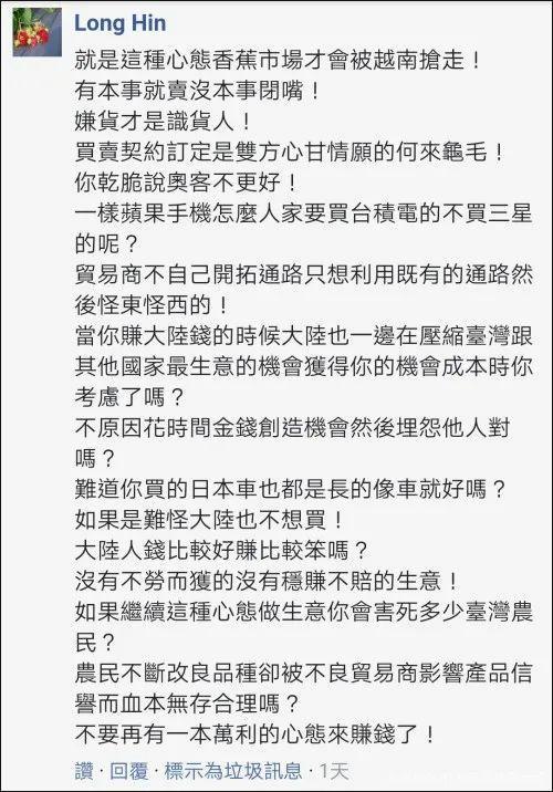 很显然,在杨宇帆等台湾凤梨农的眼中,出口凤梨到大陆是赚“不麻烦”的快钱。这般露骨的发言引来台湾网民讥讽:这世上根本就没有不劳而获、稳赚不赔的生意,心态如此傲慢,遇到问题只会去埋怨和指责大陆毫无道理可言。