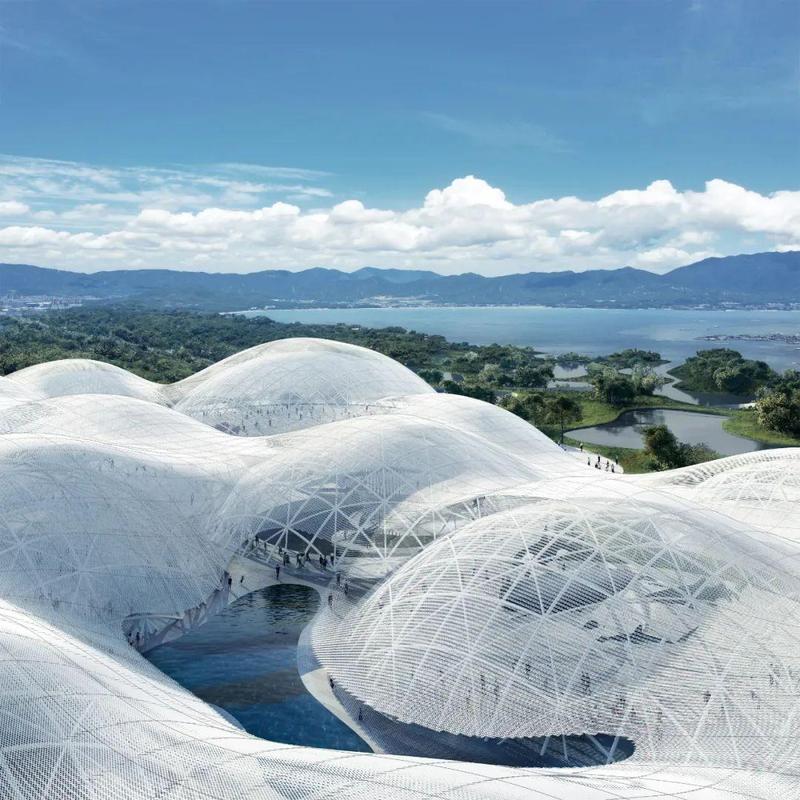 “该方案以‘海上的云’的概念,展现‘漂浮的建筑’的理念……轻柔、自由的建筑形态,与大鹏半岛独特的环境风貌紧密融合,有机连接起周边山、海、湿地和城市景观,形成陆地与海洋的有趣对话。
