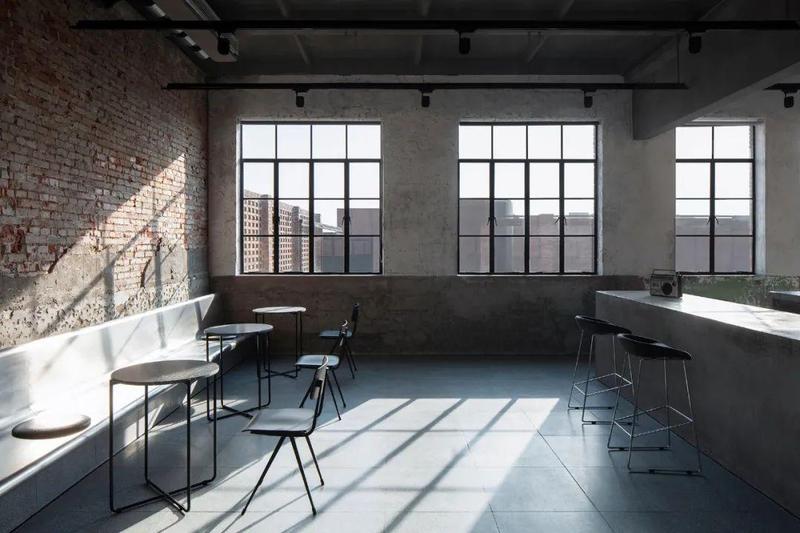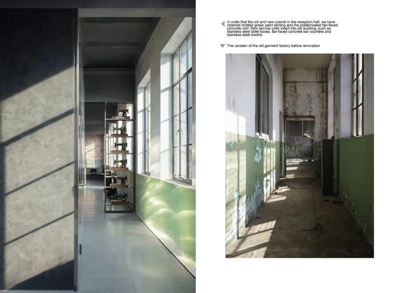 厂区内废弃的食堂改造成了酒店接待厅,保留了原建筑斑驳的绿油漆墙裙和清水混凝土预制板屋面,并且置入不锈钢材质的卫生储藏功能模块、清水混凝土吧台和不锈钢卡座。