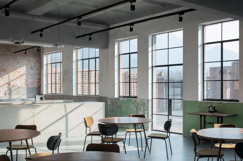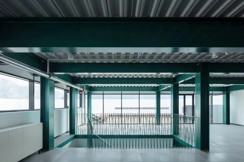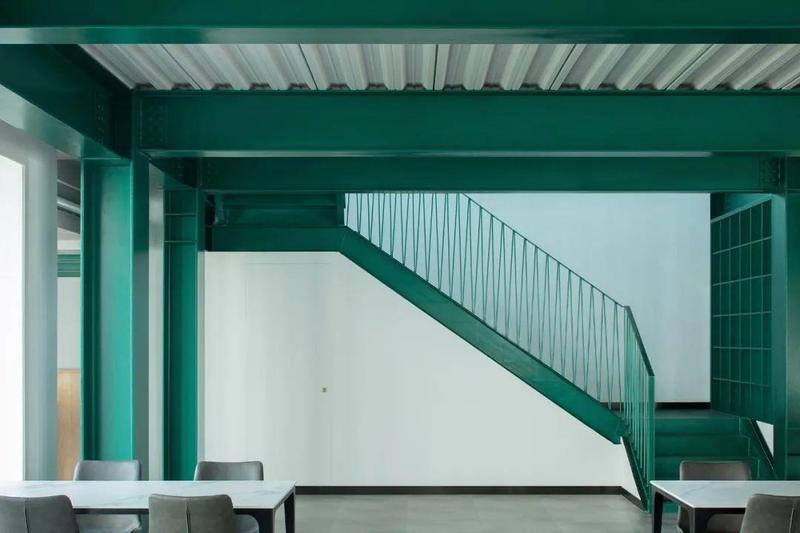 ▲餐厅室内梁柱均采用绿色氟碳漆,反差色带来了轻松的气质@夏至