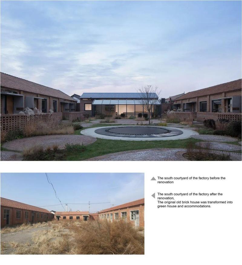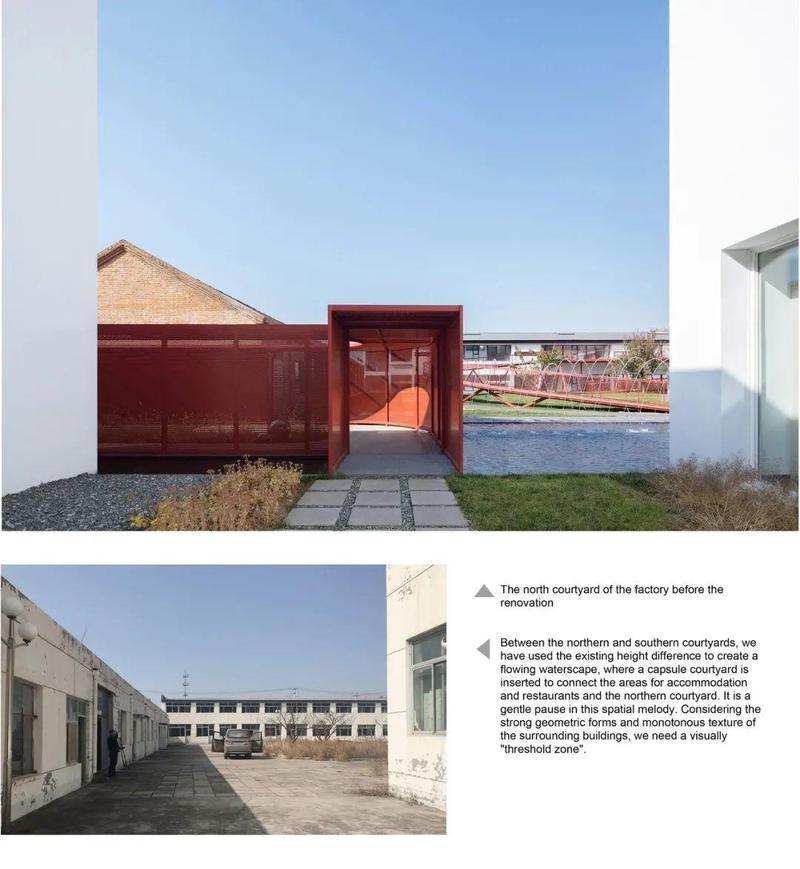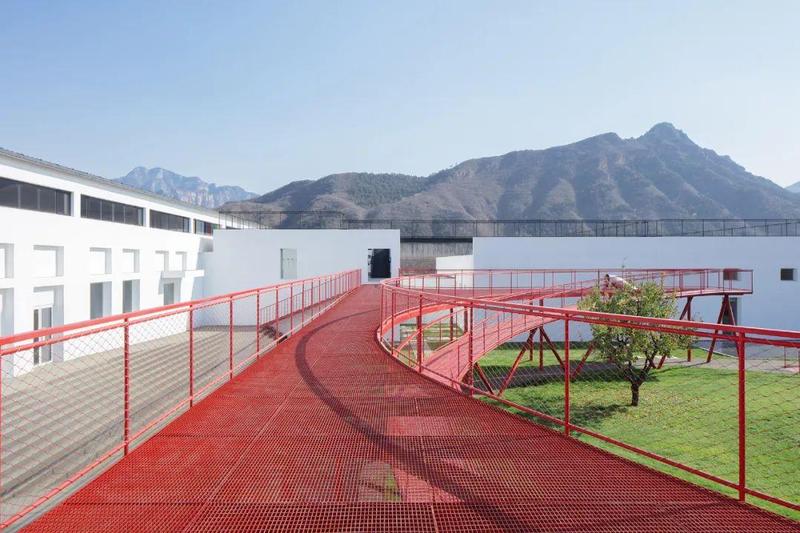 在大体量厂房与北方苍茫山脉间营造近人的尺度,通过置入步道、廊道、小广场和过庭等一系列空间构筑物,串联北院活动空间到南院住宿区的连续的立体景观体验,是密云服装厂改造项目最大的空间体验特色。