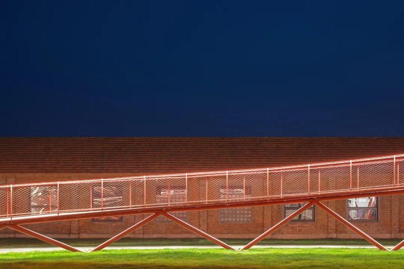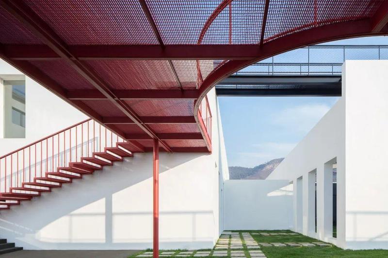 两个厂房间嵌入了门厅和卫生间体块来分隔北院与外部道路,同时让北院的视线直接与远山联系。会议、餐饮二层空间顶设置了景观廊桥,钢格栅地面与金属绳网的栏杆暗示着其作为圆环步道的延续,将人的活动导向屋顶平台。