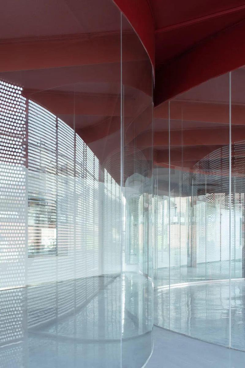 周围建筑强烈的几何形态和单调的肌理,需要一个视觉上的“冷静区threshold zone”融入背景环境,过庭漂浮在水面之上,两面穿孔的金属板墙体在一定距离观看的时候会自然重叠出摩尔纹,使画面变得模糊不清,游离在视觉的感知之外,呈现出一种如面纱般微妙的动态效果。穿孔的金属板有时会让光线透过,带来清晰的视野;有时又会让光线发生折射和扭曲。