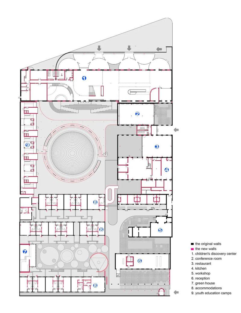 基于原始建筑尺度和结构特性,设计师把儿童科技馆、多功能厅和餐厅等需要大跨度空间的功能集中在北区;把酒店住宿功能集中在南区。