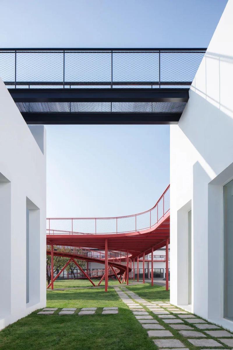 现状北院为水泥砖硬质铺地,置入圆环坡道和钢格栅平台,联系西侧儿童营地与东侧餐厅屋顶露台,使得孩子们可以在不同标高奔跑玩耍,钢格栅平台同时为地面草坪活动提供了的半透明遮阳区,使空间呈现了戏剧性的整体感。