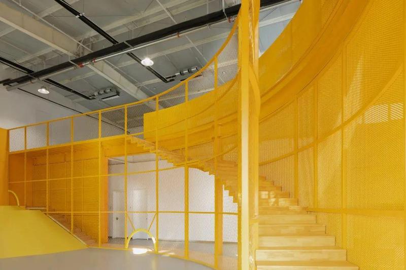 功能从动到静按楼层分区,孩子们在地面层做环形动线的肢体游戏活动;以景观楼梯为中心舞台,沿厂房纵向分别布置了钢坡道和弧形楼梯,充分利用了楼梯底部缝隙空间,结合滑梯创造出一个立体游戏区,自由路径激发各种运动的可能性。