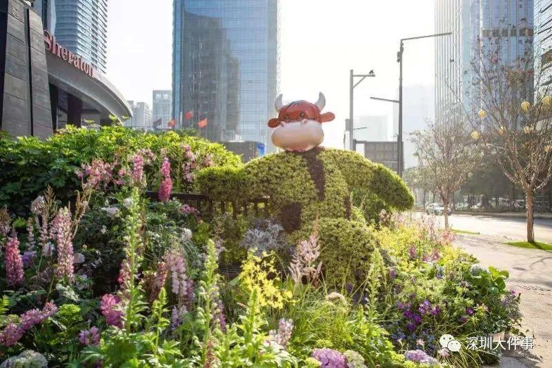 福田区节日大道以“对话”为题,结合800米长地形特点,以花卉形象“深圳牛”贯穿整个场景进行艺术装置,通过快闪式花艺展示形式,让柔美自然的花卉与激情速度的城市实现对话。