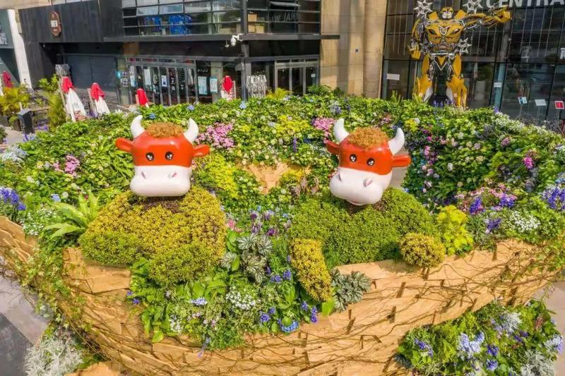 福田区节日大道以“对话”为题,以花卉形象“深圳牛”贯穿整个场景进行艺术装置,通过快闪式花艺展示形式,让柔美自然的花卉与激情速度的城市实现对话。