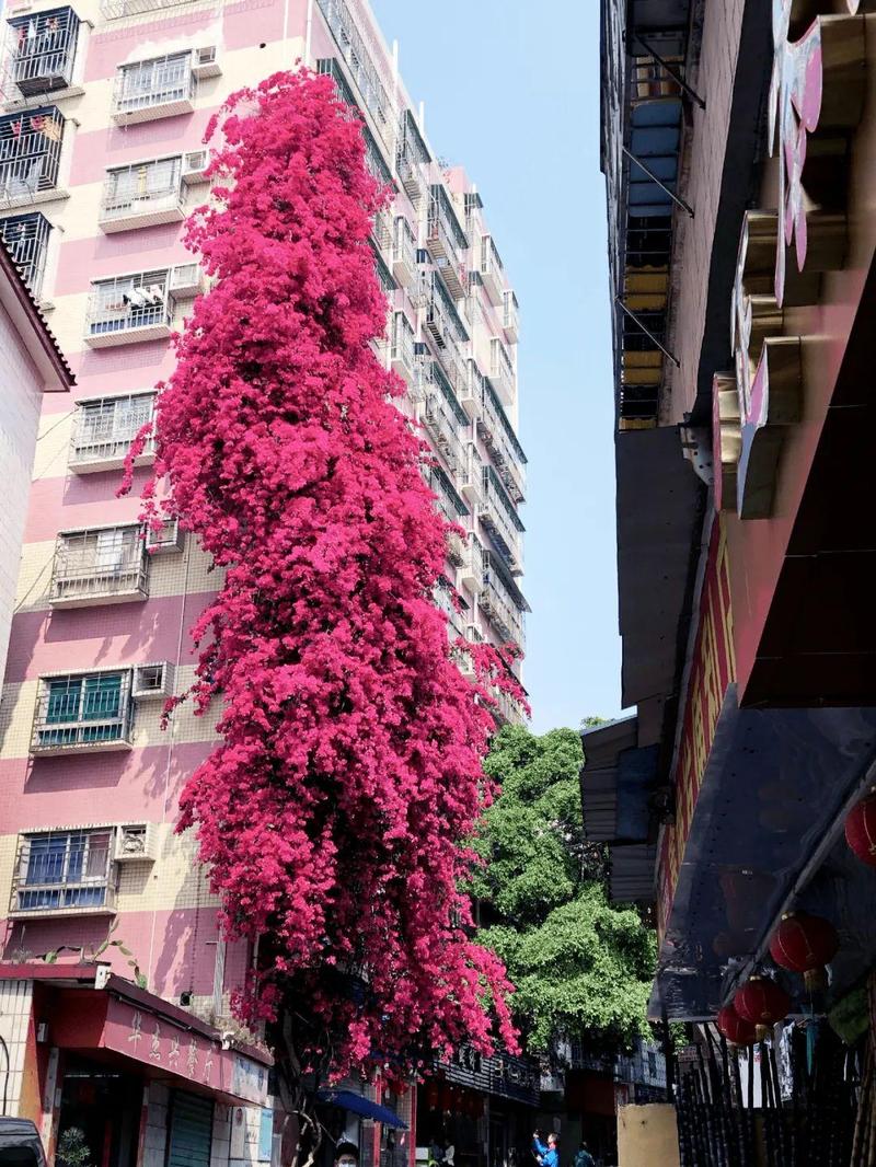 无独有偶,罗湖的莲塘村六巷,也因一棵簕杜鹃成为了深圳的“网红打卡地”。8层楼高、近26米,18年的攀爬生长,是深圳人叹为观止的“花瀑布”。