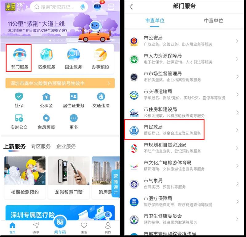 ❶ 在“i深圳”APP首页点击“部门服务”,选择“市民政局”,进入深圳市民政局服务专区后上滑页面到底部,在“殡仪服务”板块选择“智慧殡葬”即可。