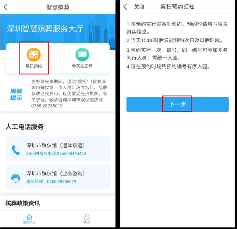 ❷ 在“智慧殡葬”页面点击“祭扫预约”,阅读“祭扫预约须知”后点击“下一步”。
