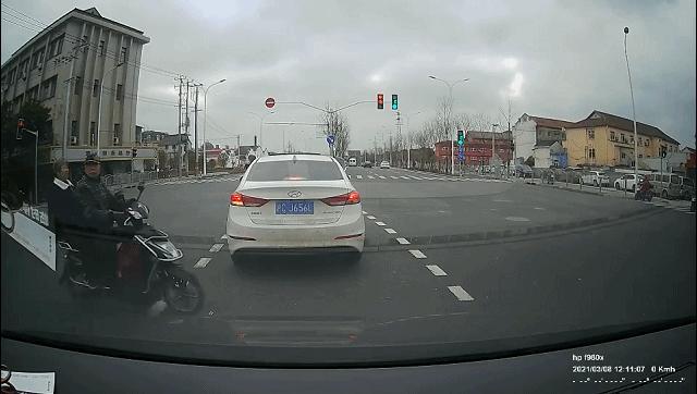 根据行车记录仪视频能判定,事发时直行车辆绿灯放行,人行横道上的信号灯是禁止通行的状态,而此时电动自行车见缝插针地从左转待转车辆中穿过,试图抄近道闯红灯,结果与直行方向快速驶来的一辆黑色小车发生碰撞。