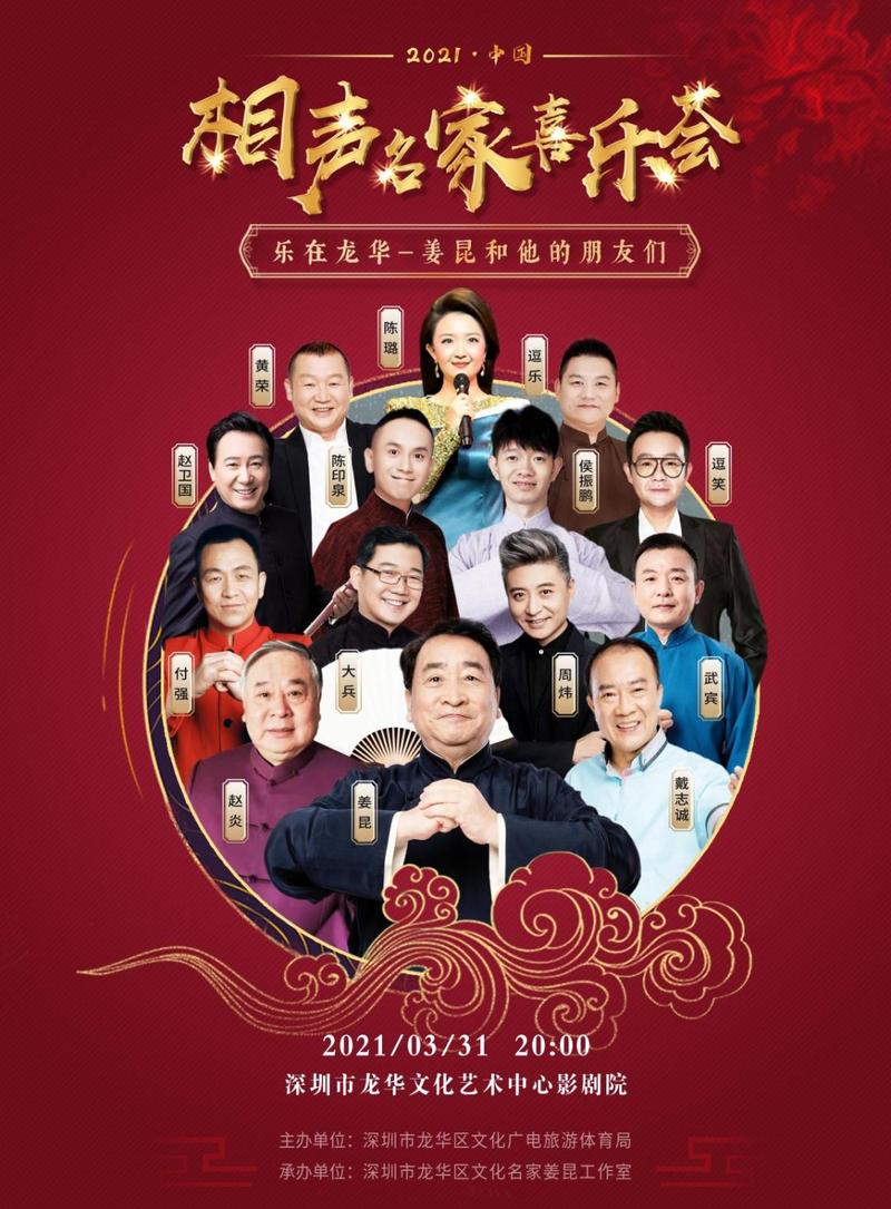 本次专场演出由著名相声表演艺术家、龙华区文化名家姜昆老师领衔,携手赵炎、戴志诚、周炜、大兵等全国相声名家,为龙华观众奉献一台笑料十足、诚意满满的欢笑大餐。
