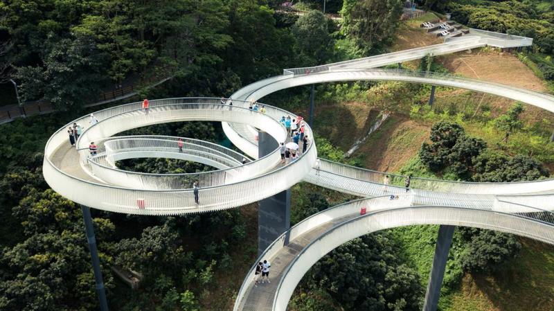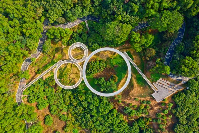 虹桥公园位于光侨路与大顶岭之间,占地面积约410公顷。公园包括三个区域,由西至东分别为入口区、碧湖区和森林区,三个区域由一条长约4000米的红色空中栈桥串联。