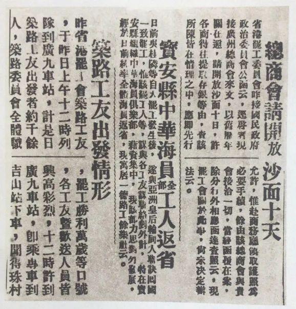 1925年6月19日,为声援上海人民“五卅”反帝爱国运动而举行的省港大罢工正式爆发。最先发难的是海员工人。英商省港澳轮船公司行驶省港之间的佛山、龙山、金山等轮抵港后,船上海员当即宣布罢工离船,打响了省港工人罢工第一炮。次日,返回广州的工人达2000人。电车工会于19日晚上发出罢工令。翌日,市内交通停顿,人们无法上班、上工或上学。全港顿时陷于瘫痪状态,秩序大乱。20日起,香港各行业工人纷纷罢工。