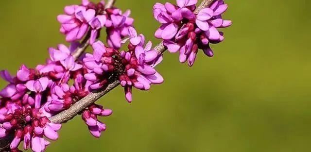 3-4月份开花,它很好辨认,光秃秃的杆子上,密密麻麻一堆紫色大米粒似的的花朵,一簇簇挤在一起,没有叶子。