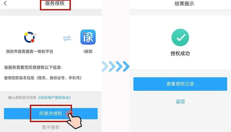 使用政务服务一体机自助办理事项,选择“i深圳扫码认证”,自助终端跳出二维码,用“i深圳”App扫码登录并点击“同意授权”,完成用证授权。