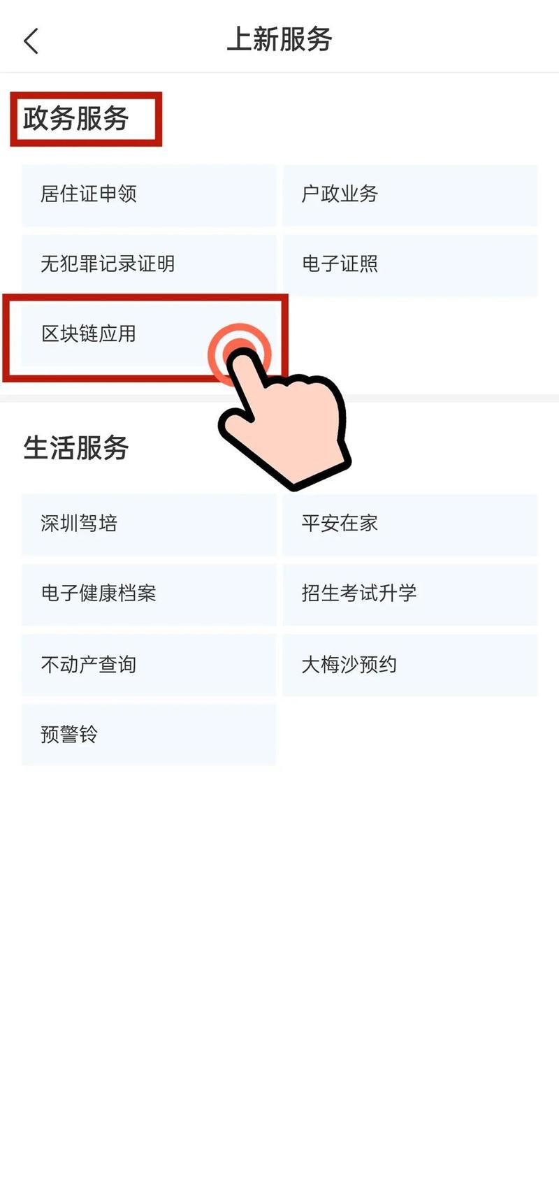 打开“i深圳”App,在首页“上新服务”栏目——更多服务中找到区块链电子应用,实名认证后即可添加和查看本人名下的电子证照。