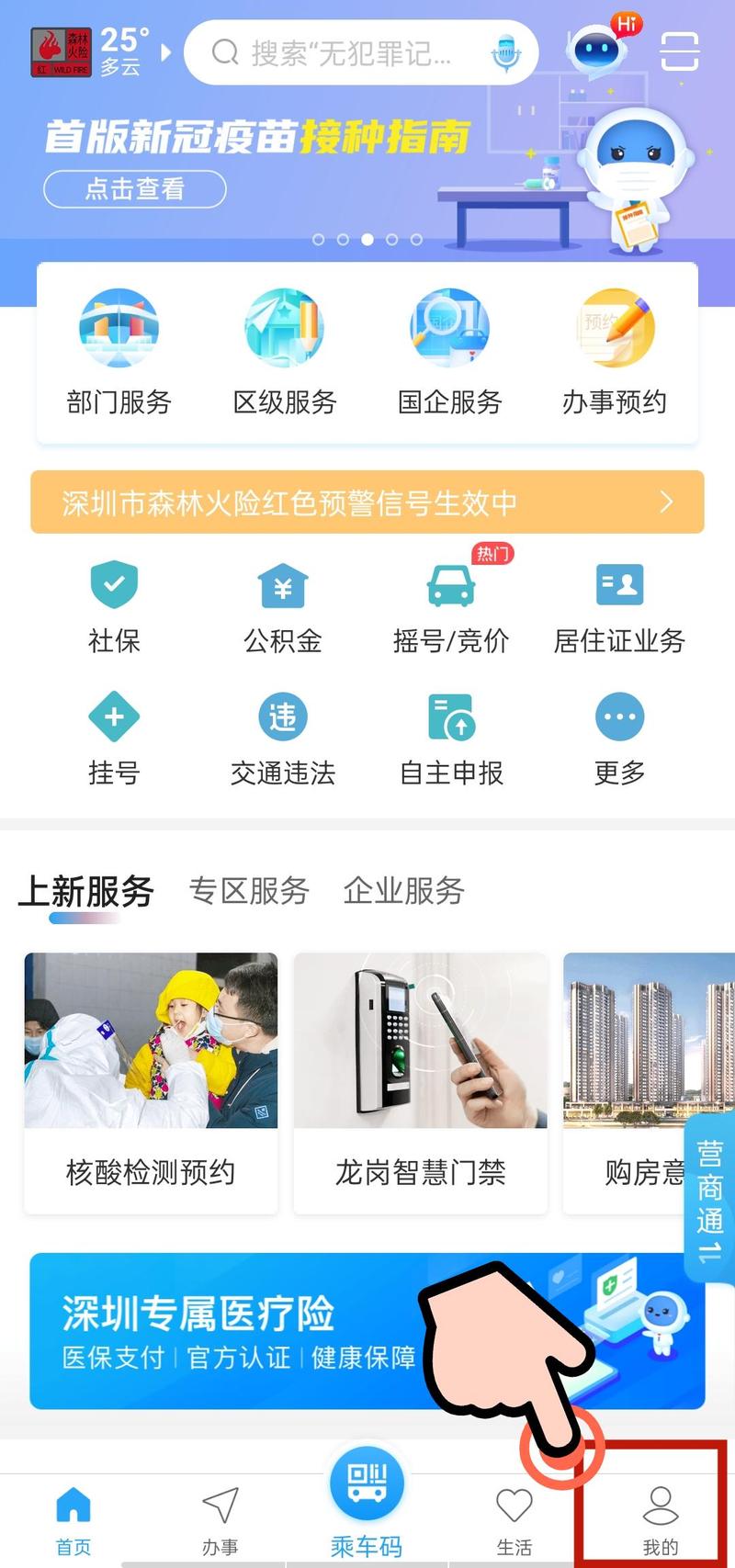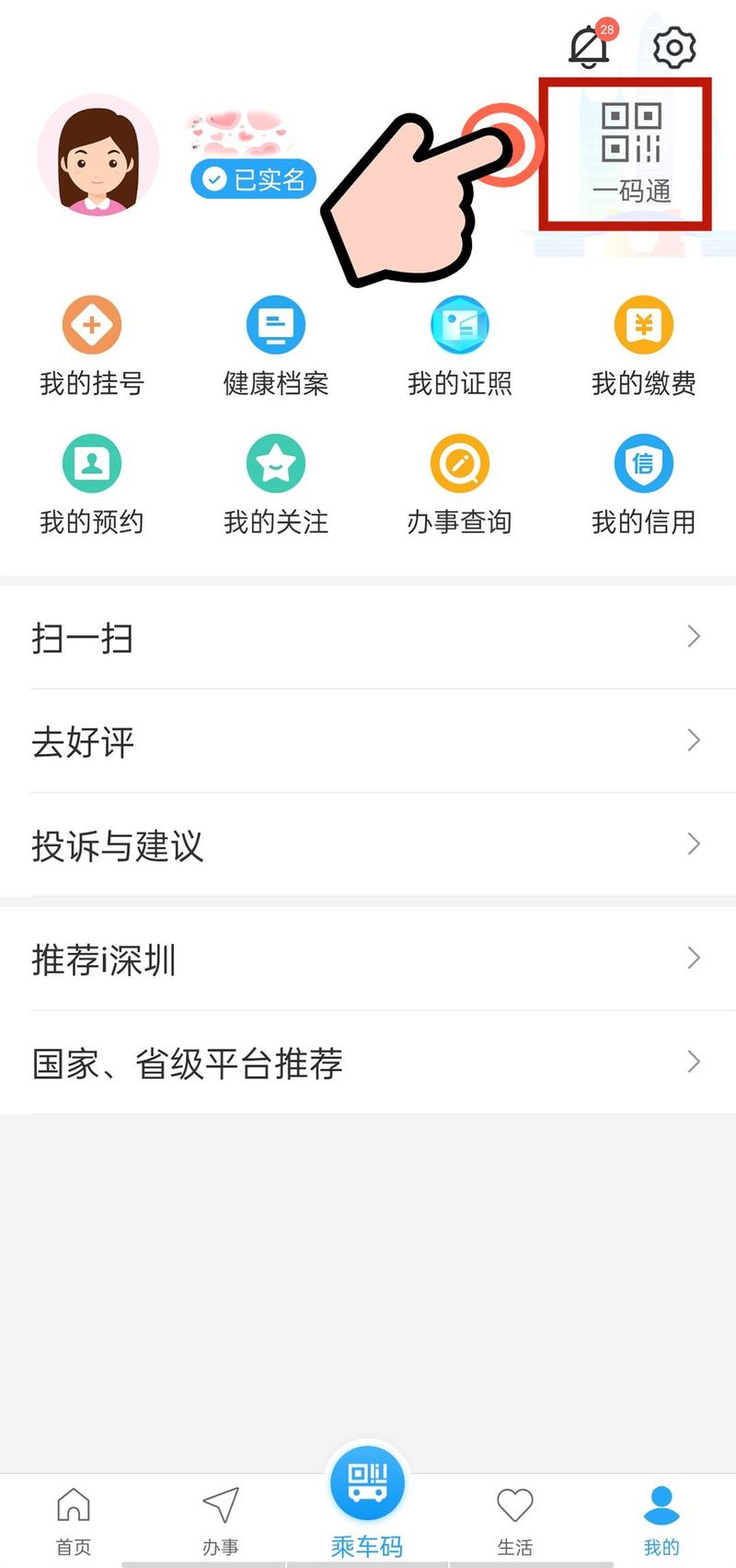 登录“i深圳”App——点击“我的”——右上角“一码通”,选择符合的办事场景后通过刷脸或指纹识别的方式进行实名验证,验证通过后即可跳出二维码,待窗口工作人员扫码后,在App上勾选《i深圳市民一码通开通及使用协议》完成用证授权。