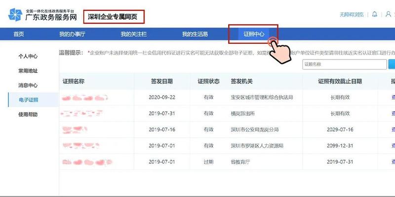 登录广东政务服务网,将行政部门切换至深圳市—南山区,点击“企业网页”,在“深圳企业专属网页”点击“证照中心”,即可查看企业电子证照信息。