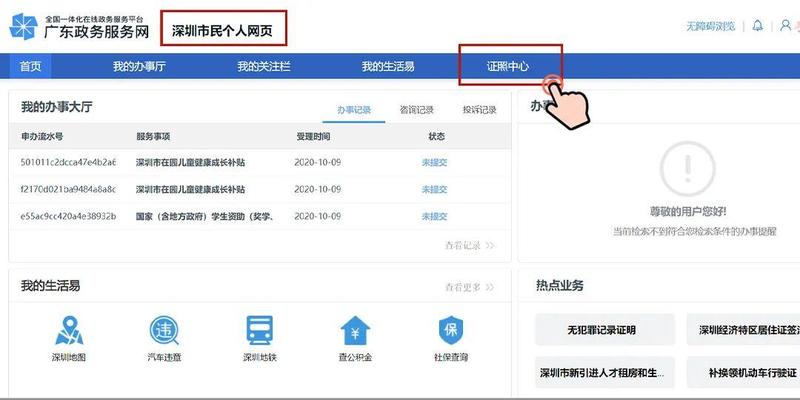 登录广东政务服务网,将行政部门切换至深圳市—南山区,点击“市民网页”,在“深圳市民个人网页”点击“证照中心”,即可查看个人电子证照信息。