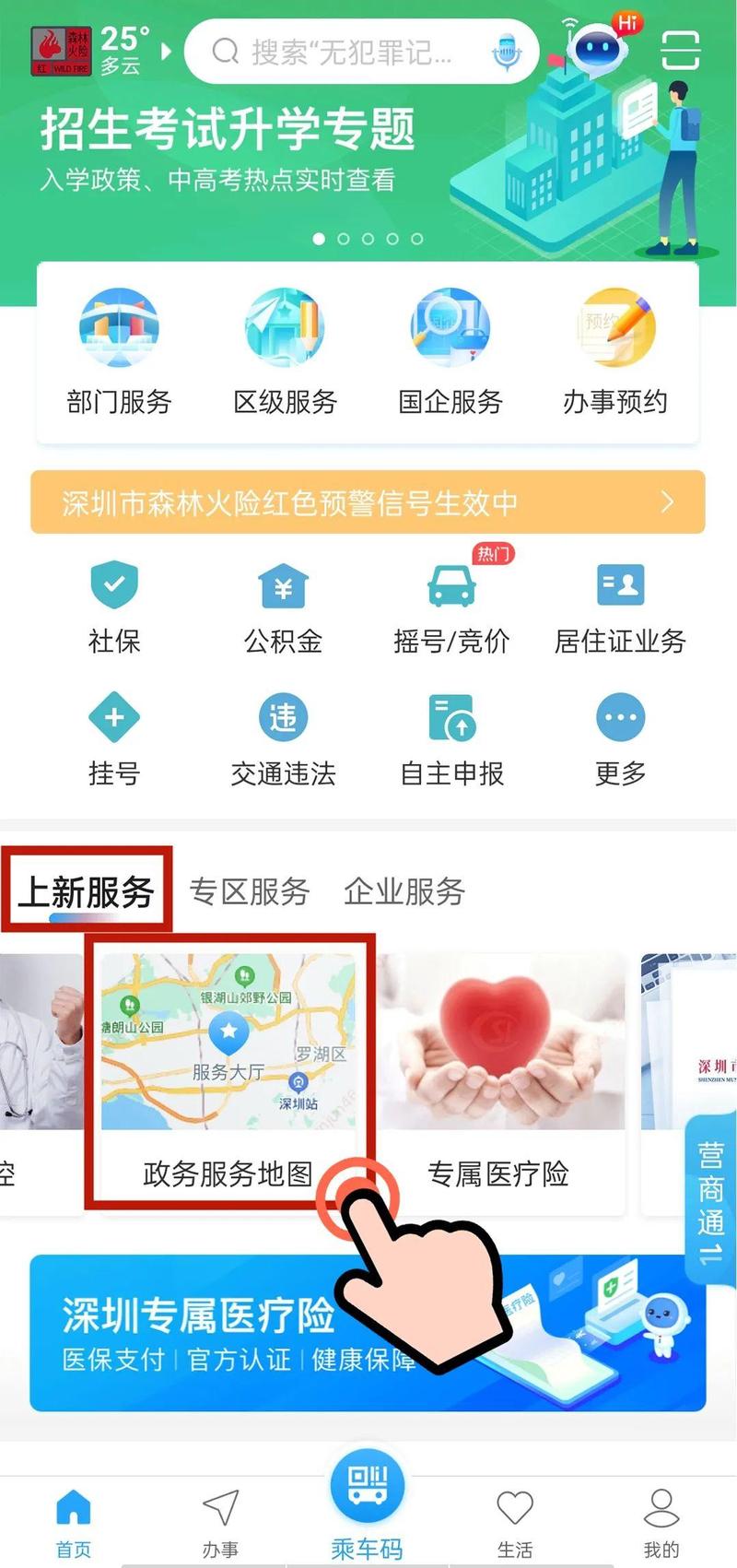 打开“i深圳”App,在首页“上新服务”栏目滑动至“政务地图”,点击进入,通过“选择区域”查找便捷的政务服务自助终端所在地址。