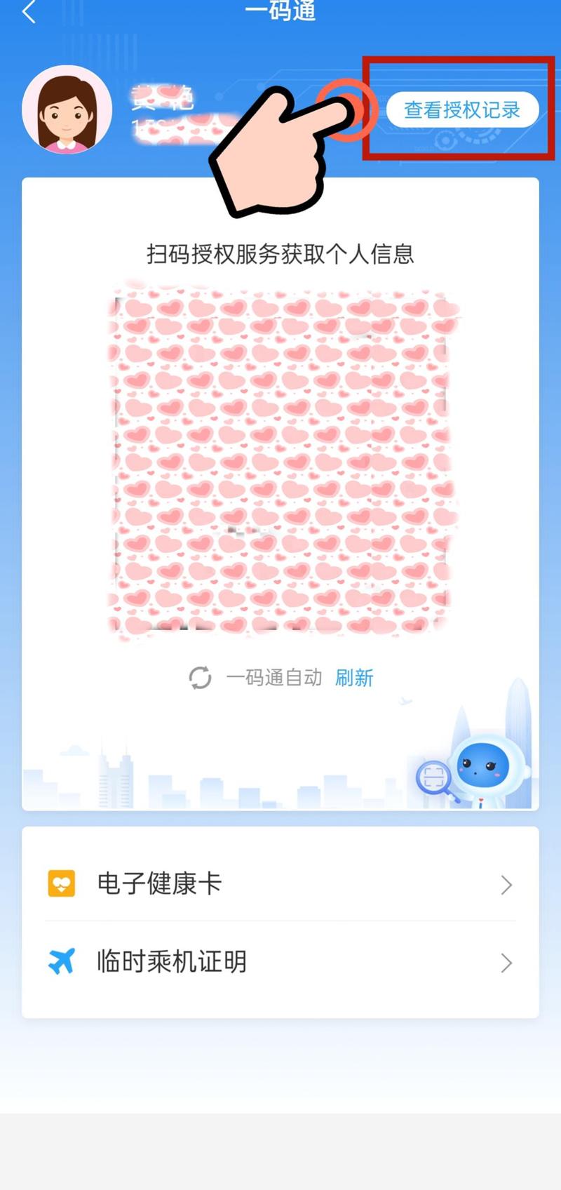 打开“i深圳”App,点击“我的”,点击右上角“一码通”,选择办事场景后,通过实名认证后即可查看“授权记录”。