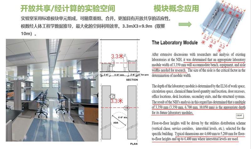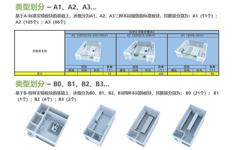 将不同的工艺模块按照类型划分为标准实验室和特殊实验室,标准实验室采用几种不同面积规格,通过不同的序列组合,采用组合隔断轻钢龙骨墙体,以便未来的灵活使用,形成可持续发展的建设模式。特殊实验室在满足工艺需求的前提下,尽量预留足够荷载,提高空间尺度,为未来实验设备的迅速发展变化提供更多的弹性空间。