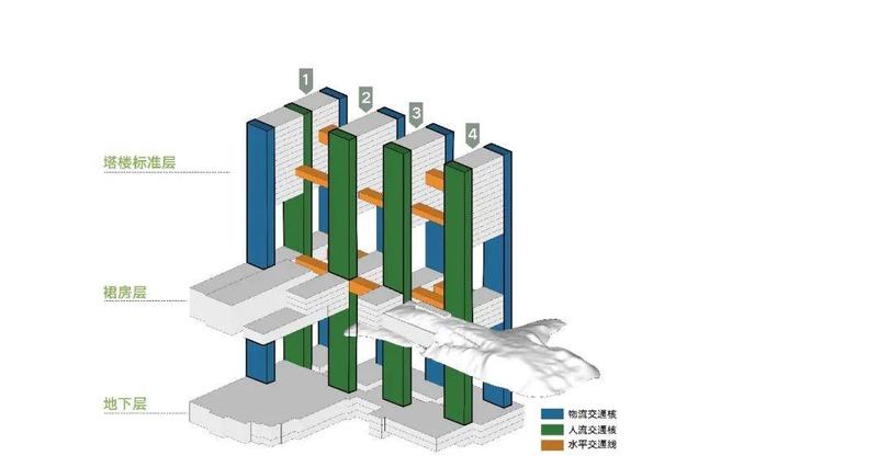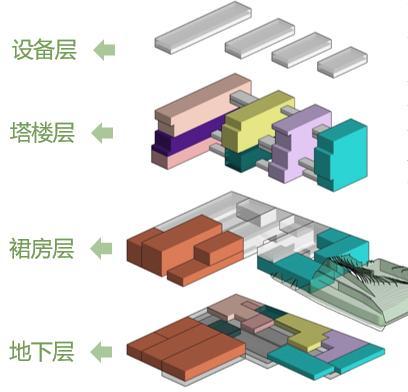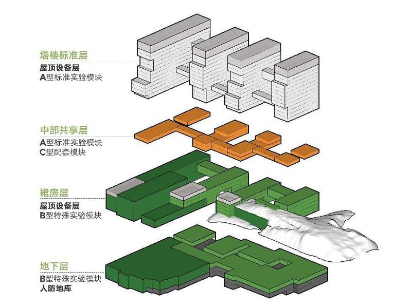 项目充分利用立体高度,以空间的科学布置,促进用地集约。通过梳理功能空间特性,将大型实验室在首层和地下层集中设置,其余实验室在充分利用规划高度条件下,采用水平分层功能布局逻辑,依次由下到上布局,清晰地形成了水平分层功能逻辑与大型实验室体量布局逻辑。