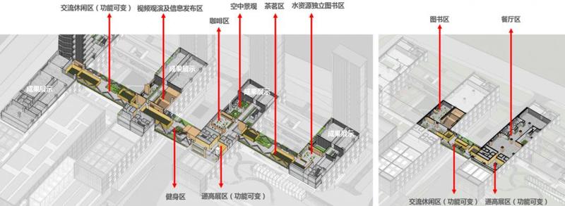 项目充分发挥实验室集群效应,通过优化功能布局,整合公共配套功能,在5F、6F集中设置配套共享模块。其中,在6F架空层之间有序布置8个功能模块。模块3和5为公共配套业态,其余模块为成果展示大厅模块。结合南北联通的空中连桥,实现各楼宇间互通互达、相互沟通。
