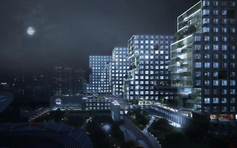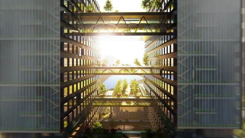 集群促进交叉,绿色激发灵感。由于项目用地十分紧张,开放空间平面展开设计条件有限。设计采用纵向立体化生态策略,通过景观及开放空间由下而上蔓延,将绿意贯穿建筑内外,既将用地还给了功能,同时又创造了大量多维景观环境。此外,结合山体景观延伸,让绿意融入建筑每一个空间维度,形成立体化生态桥廊,为城市、为学生们营造了一个温馨惬意的科研实验和休闲空间。