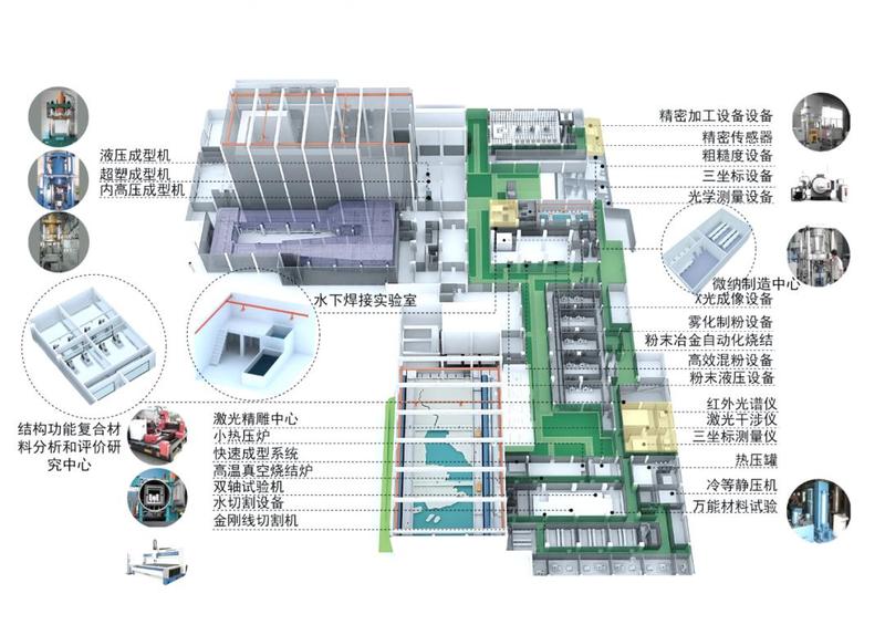 促进学科交叉共融是集群的核心。项目以学科分类逻辑进行功能组织,强化相邻科学之间的创新共享。网络空间安全、空间信息网络及应用、可调谐实验室里的空间传输部分共同构成了信息学科类平台,特种环境复合材料、先进焊接与连接、可调谐实验室里的微纳米材料部分共同构成了材料学科类平台。三个板块实验室相对临近,且在B1层的分属于三个板块的特殊实验室及大型仪器设备实验室直接相连,设备平台可实现有效共享。