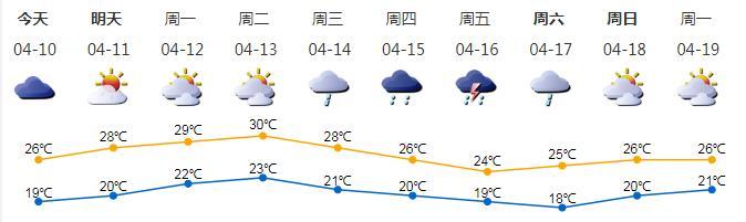 ●今日多云间晴,天气清凉,适合户外运动。气温19-26℃;东风3级,沿海、高地和海区阵风6级;相对湿度50%-85%。4月11日-13日多云为主,气温回升;4月14日-16日有(雷)阵雨。