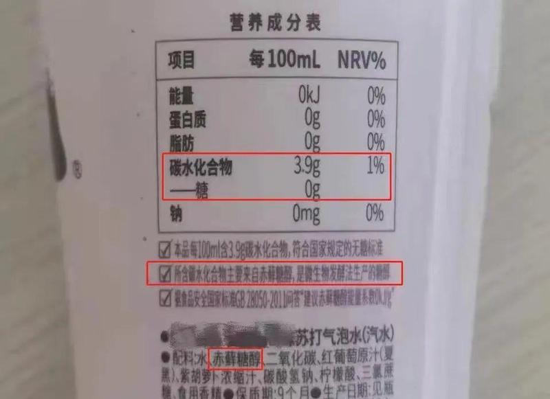 而苏打气泡水的营养成分表则显示,每100ml饮料中含糖0g,含碳水化合物3.9g,饮料中所含的碳水化合物主要来自赤藓糖醇。