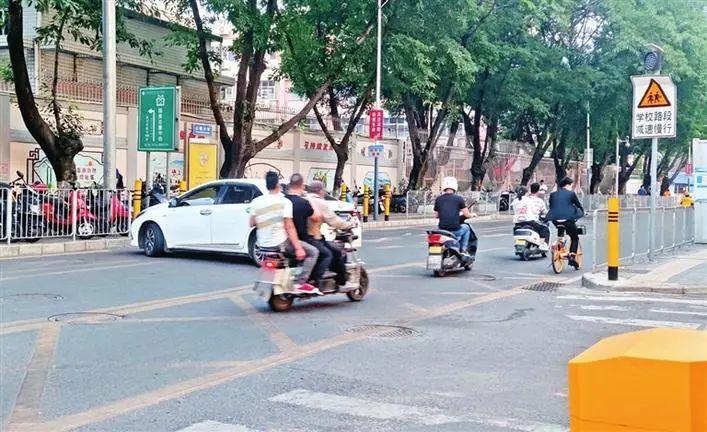 松岗街道沙江路,市民违规载人在道路上骑行电动二轮车。