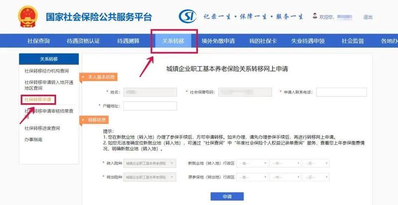 ①登录国家社会保险公共服务平台(http://si.12333.gov.cn)或“掌上12333”选择“关系转移”-“社保转移申请”,选择“城镇企业职工基本养老保险关系转移网上申请”功能。