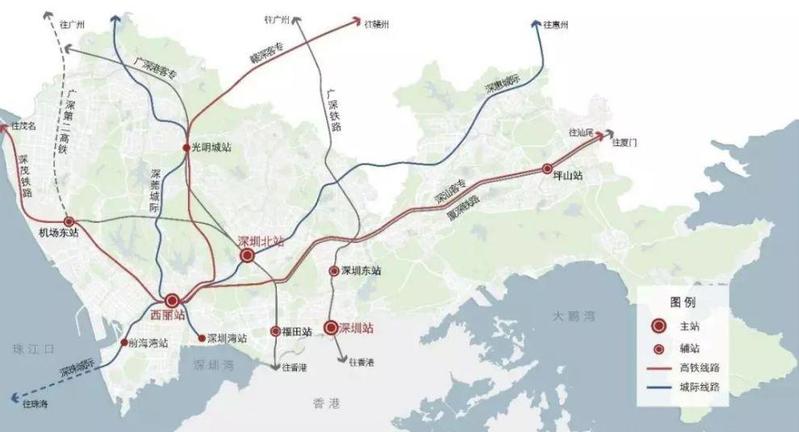 根据国家铁路、城际轨道和城市轨道相关规划,西丽综合交通枢纽将引入赣深客专、深茂铁路、深汕铁路、深珠城际4条高铁,深惠城际、深莞增城际2条珠三角城际铁路、地铁13号线(在建)以及规划中的多条城市轨道,与其他城市公共配套设施、城市道路、慢行系统一同构筑城市空间,成为深圳最重要的对外交通门户和城市交通转换节点。