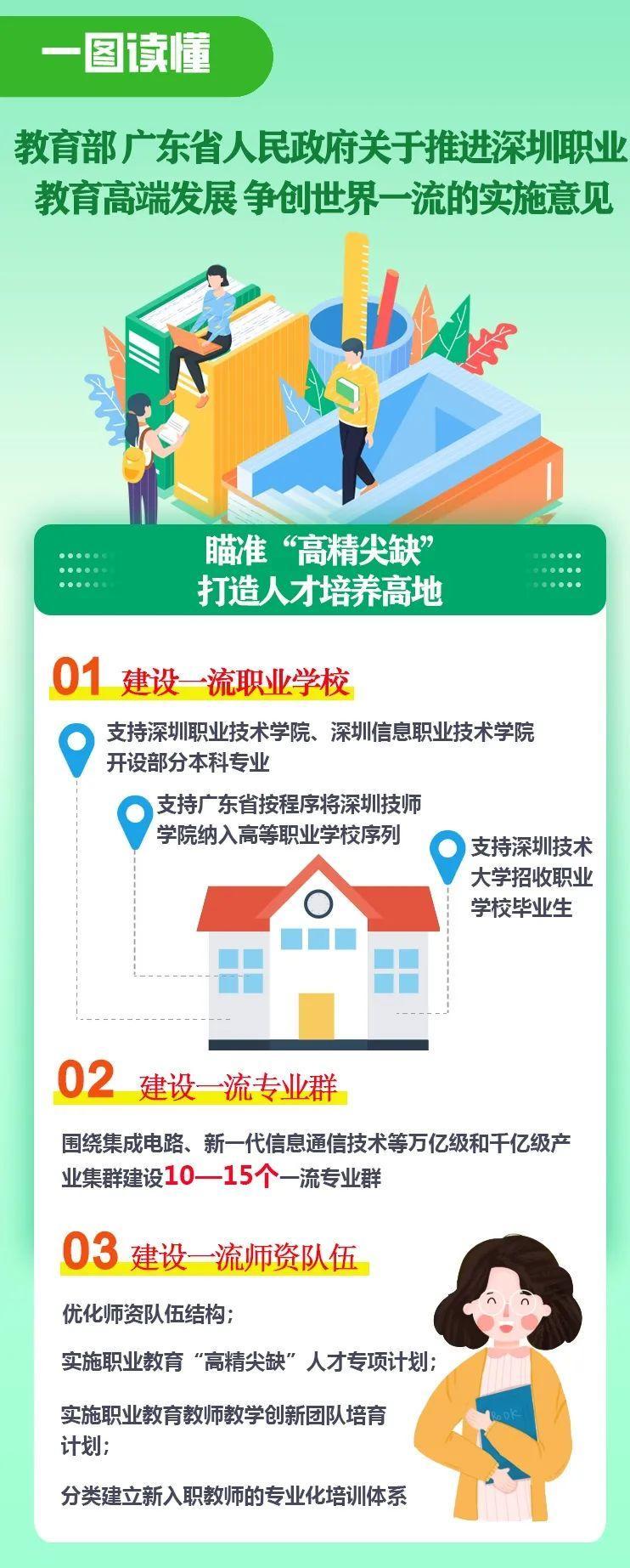 其中包括:在建设一流职业学校方面,实施高水平中职学校建设计划;推动中高职教育集团建设,促进中高职一体化协同发展;大力发展本科层次职业教育,组织深圳职业技术学院、深圳信息职业技术学院按程序申报本科层次职业教育专业;推动深圳技师学院纳入高等学校序列、深圳广播电视大学更名深圳开放大学;支持广东新安职业技术学院打造民办品牌高职院校。