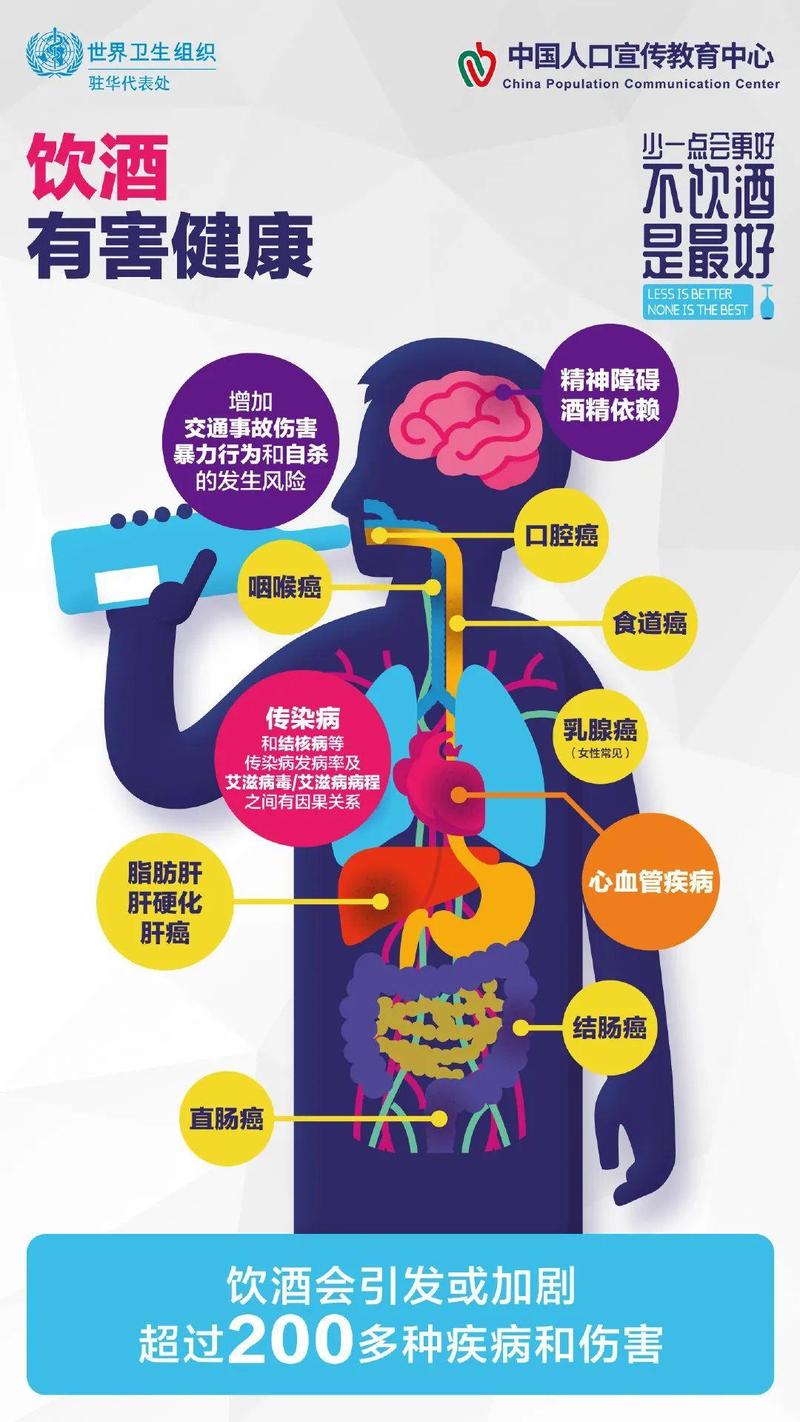 酒精引发了心血管疾病、结核病、传染性疾病、癌症、暴力和自残等故意伤害,以及交通事故和溺水、火灾等其他意外伤害