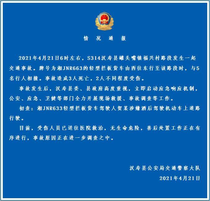 通报称,4月21日6时左右,S314汉寿县罐头嘴镇福兴村路段发生一起交通事故。牌号为湘JNR633的轻型拦板货车由西往东行至该路段时,与5名行人相撞。事故造成3人死亡,2人不同程度受伤。初查,湘JNR663轻型拦板货车驾驶人贺某涉嫌酒后驾驶机动车上道路行驶。