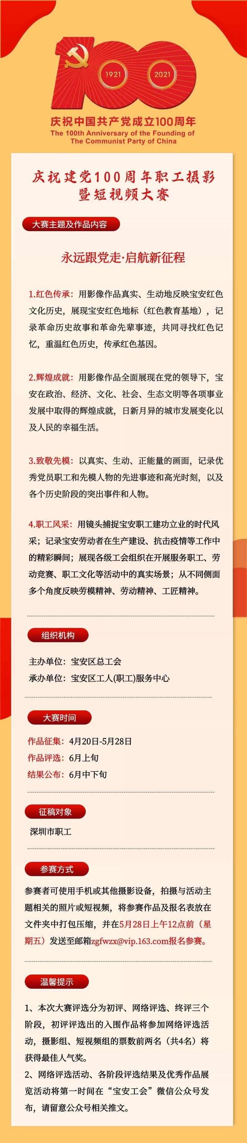 为庆祝中国共产党建党100周年,宝安区总工会举办了庆祝建党100周年职工摄影暨短视频大赛,爱拍视频的小伙伴不要错过这次机会哦!