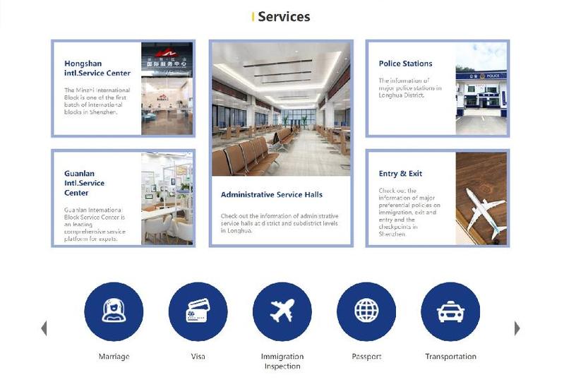 在“服务”栏目下为观澜国际街区服务中心及红山国际化服务中心开辟专栏,为居住在国际化街区的外籍人士提供更为直观便利的服务指南。