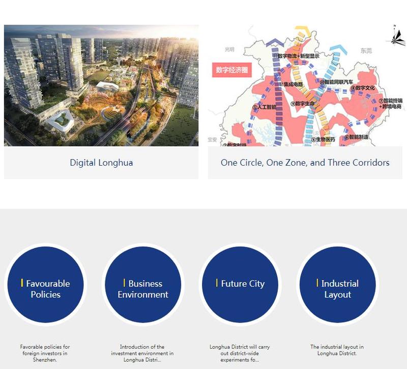 网站在“营商”栏目开辟了专门的二级栏目阐述“数字龙华”“一圈一区三廊”“未来城市”等新理念。
