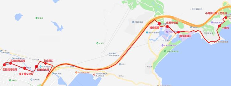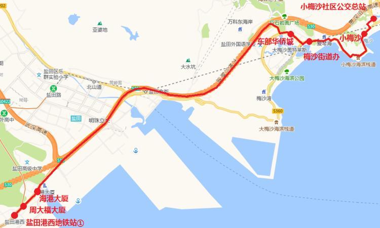 盐田路地铁站、东海丽景花园、庚子首义学校、盐田派出所、北山路口、梅沙医院、东部华侨城、梅沙街道办、小梅沙、小梅沙社区公交总站