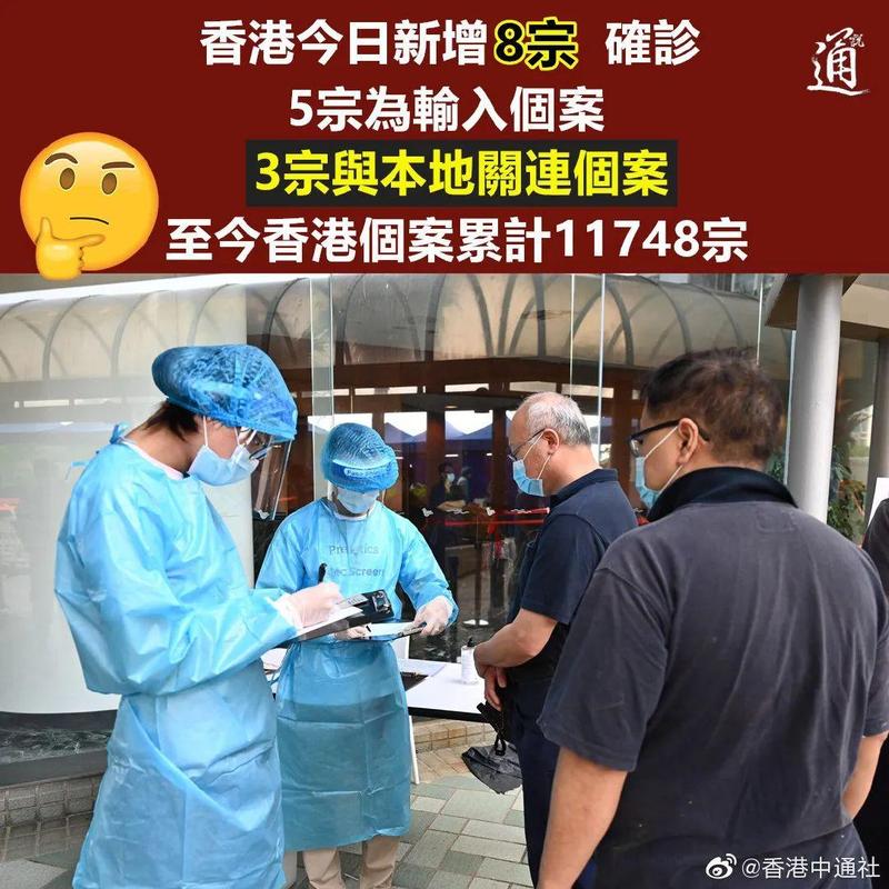 香港卫生署卫生防护中心当天下午公布,香港新增8例确诊病例,包括5例输入病例,3例与本地病例有流行病学关连,无源头不明病例。至今香港病例累计11749例(包括11748例确诊病例和1例疑似病例)。
