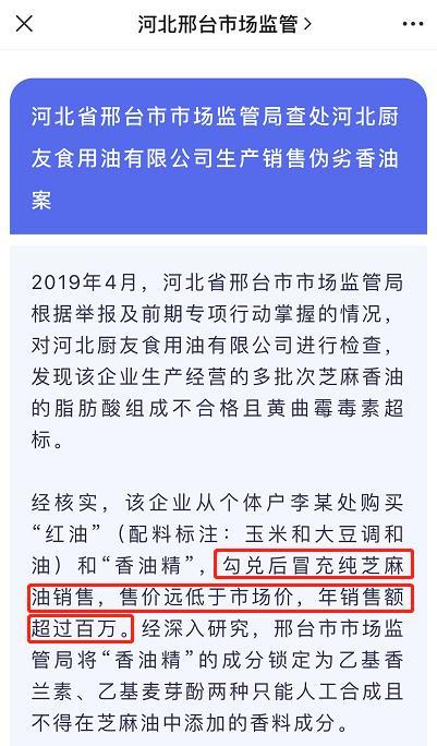 近日,市场监管总局通报了“河北省邢台市市场监管局查处河北厨友食用油有限公司生产销售伪劣香油案”。