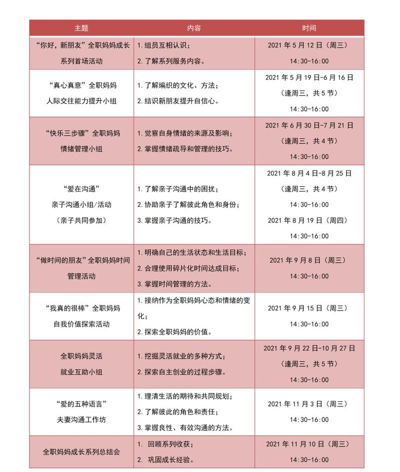 区妇儿中心家庭服务园社工设计全职妈妈成长系列,通过人际交往、情绪减压、技能提升(时间管理、亲子沟通、夫妻沟通等)等服务,协助全职妈妈认识新朋友,享受当下的幸福,缓解压力,提升自我价值,绽放新光彩。