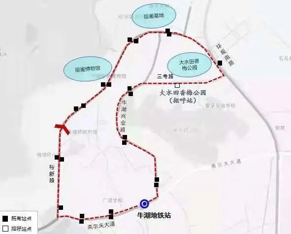 停靠站:牛湖地铁站、牛湖社区、石一村小组、深德技校、美联红木艺术博物馆、俄地吓小区、南兴工业区、广培社区、版画村、版画基地、菠萝岭路口、大水田香梅公园(招呼站)、驼鸟山庄、鳌湖艺术村、牛湖老村路口、牛湖地铁站