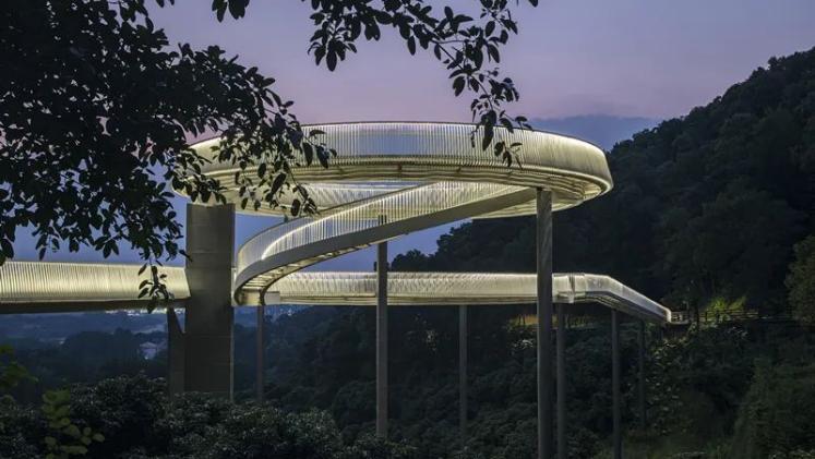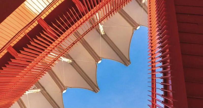 三个区域由一条长约4000米的红色空中栈桥串联
