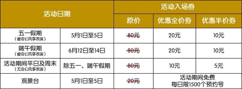 5月1日-5日,游客每天上午10点前购票入园,均可享受门市票价6折优惠。即成人票仅需48元/张(原价:80元)、儿童票仅需24元/张(原价:40元),每个ID限购一张。